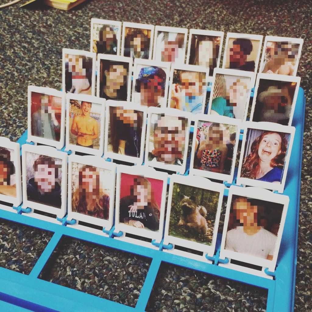 Step Four: Print out two copies of each picture and cover up each Guess Who face with your new, unique version (make sure the picture you print out is the right size). One for each game board slot, another to go in the card pile.
