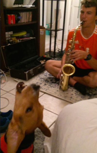 He howls more than he barks. He hardly ever barks, and he only sometimes howls. Nothing puts Nap in an angsty, melodramatic mood like howling. He howls in response to three different sounds: firetrucks (he has to be right next to the firetruck as it’s going by, giving a full-body lament that often earns a laugh from the firemen), blenders, and my boyfriend’s (Addy’s) saxophone playing (this last one is understandable).